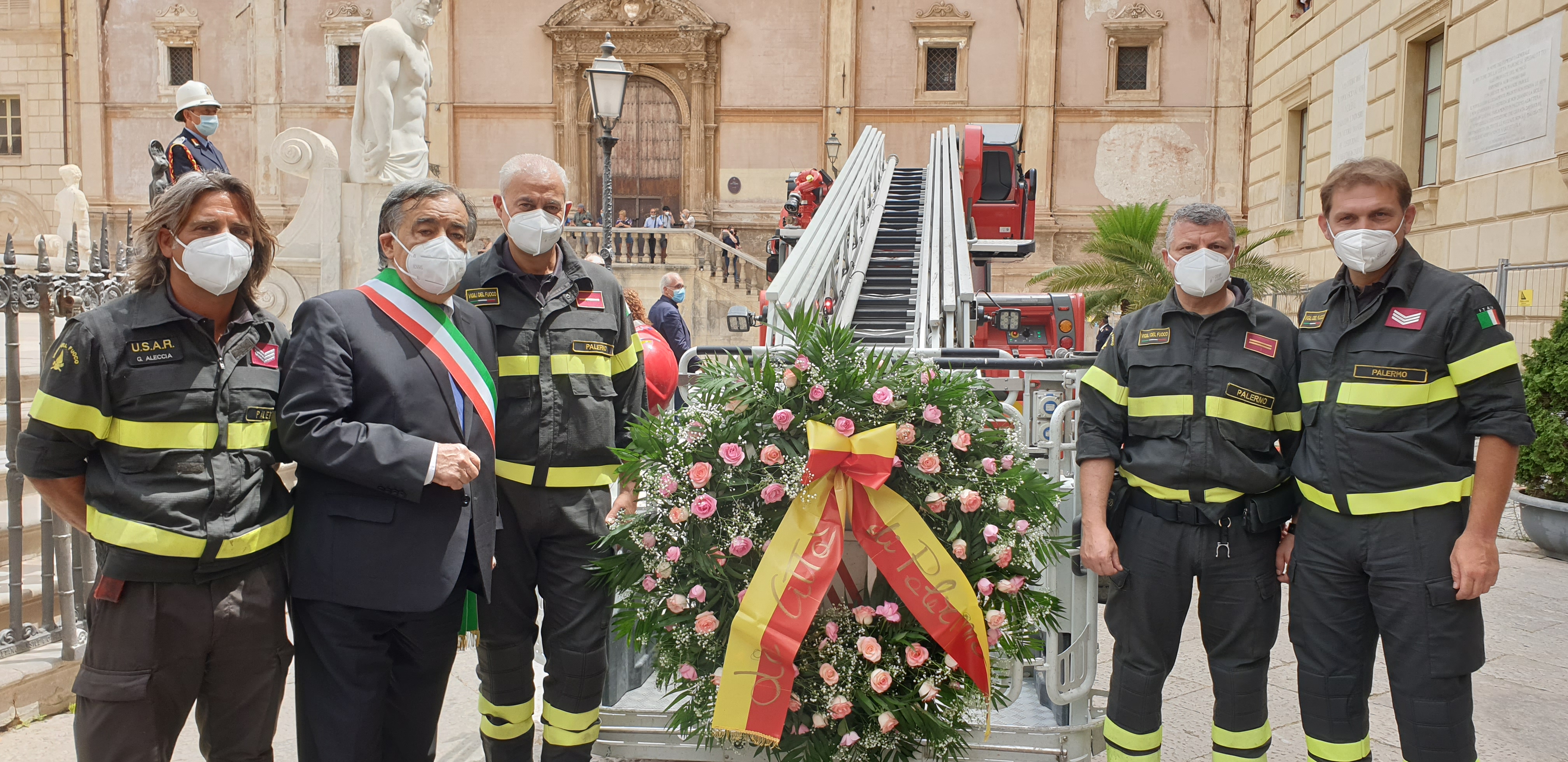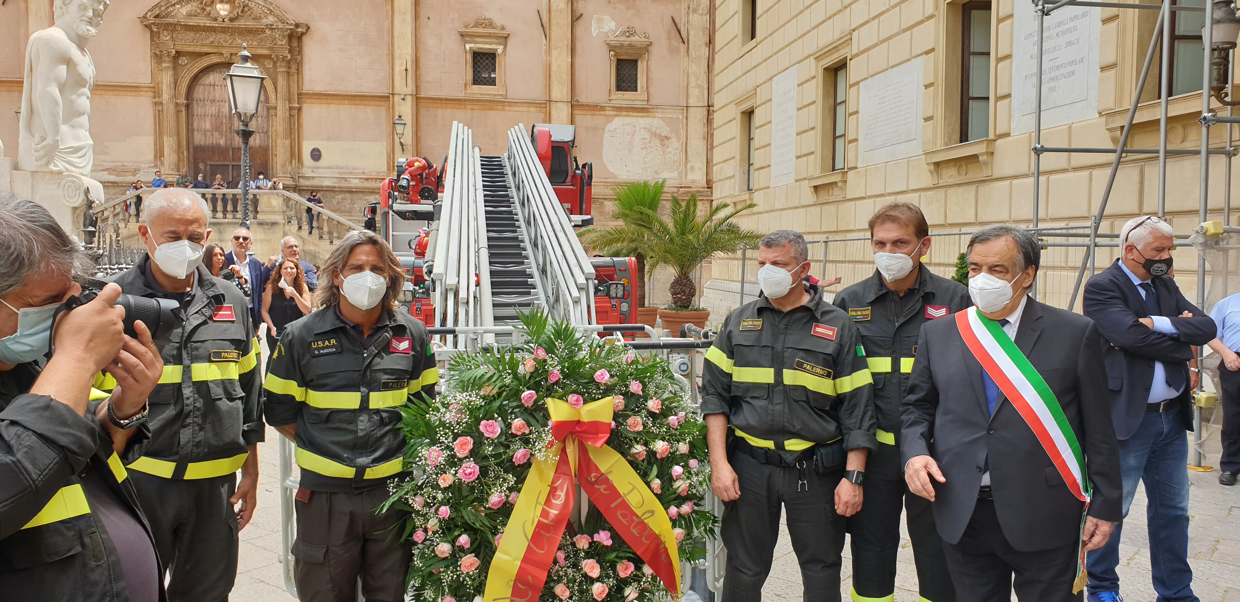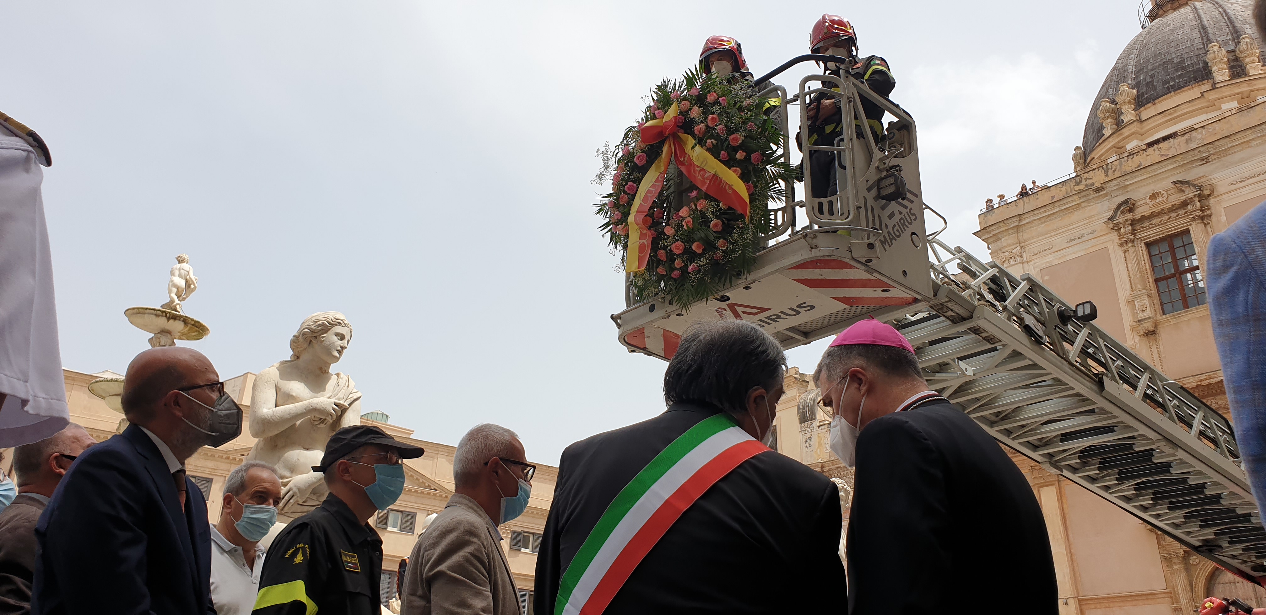 Ore 12.00: Tradizionale omaggio floreale del Corpo dei Vigili del Fuoco alla statua di S. Rosalia posta in cima al Palazzo delle Aquile e suono festoso dei tamburi.
