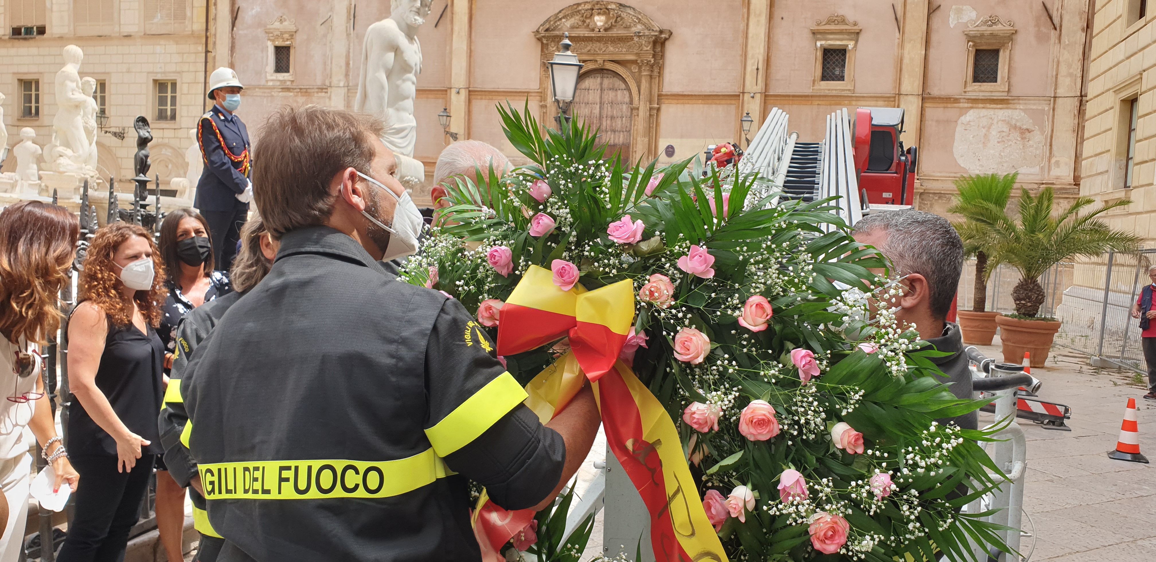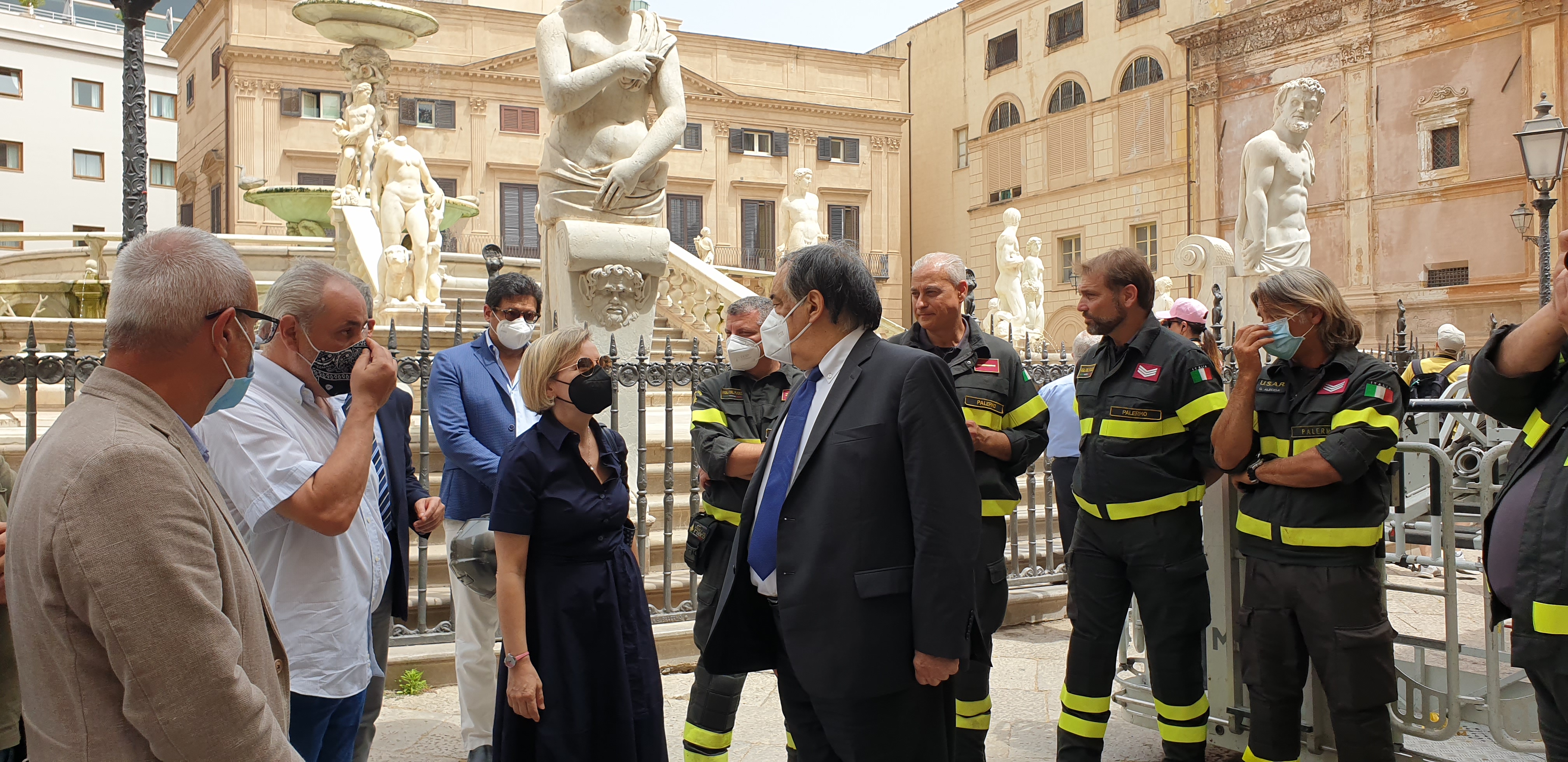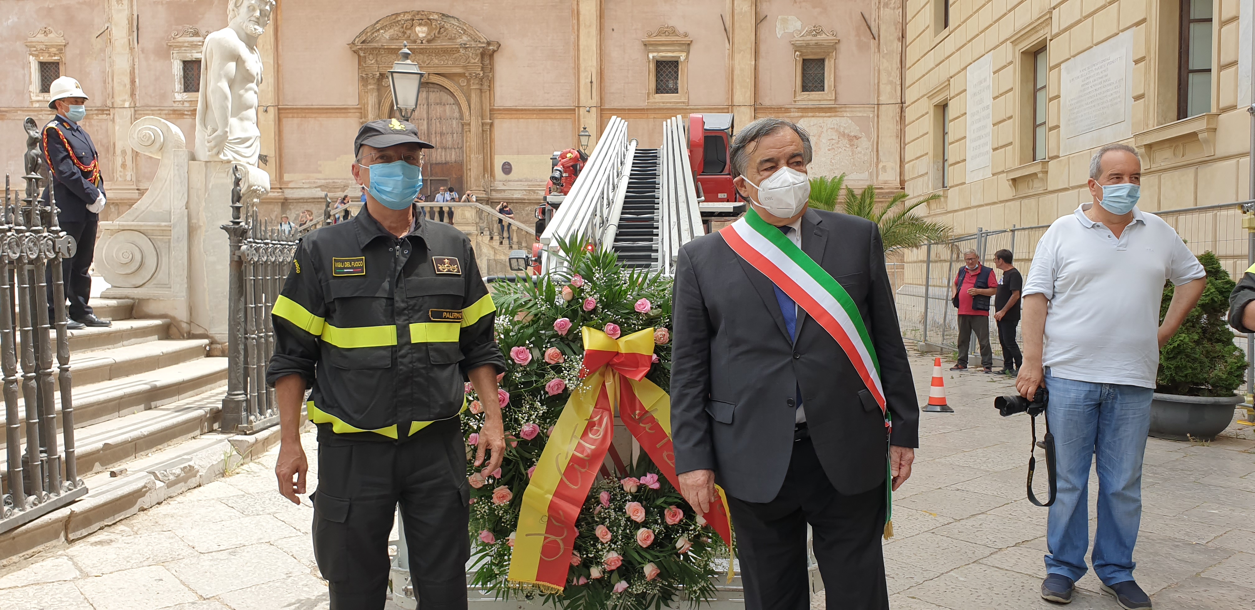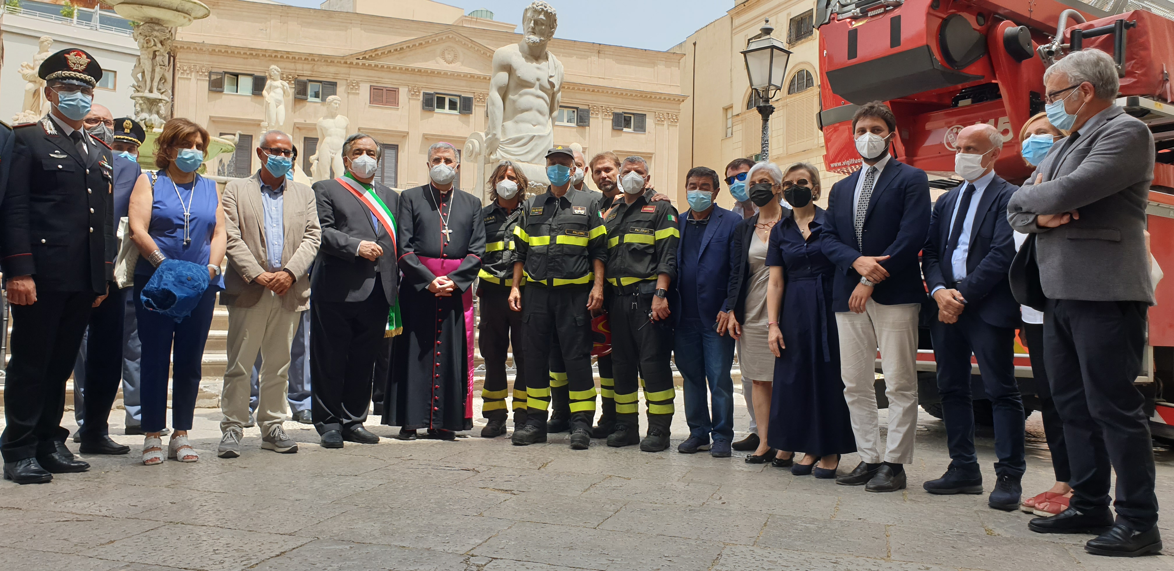 Ore 12.00: Tradizionale omaggio floreale del Corpo dei Vigili del Fuoco alla statua di S. Rosalia posta in cima al Palazzo delle Aquile e suono festoso dei tamburi.