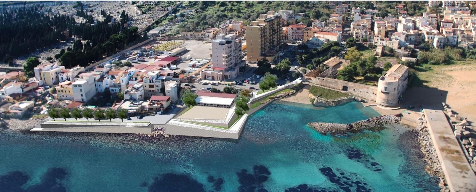 Nel progetto si propone di utilizzare il materiale dragato e prelevato dalle terre sopra quota 0 per consentire il rimodellamento/riqualificazione di un’area attigua nei pressi della zona meridionale della tonnara ed oltre il molo. Attualmente lo stato di tale luogo, altamente degradato, è costituito da una vasta area di circa 1000 mq, asfaltata e posta ad una quota di -2,70 circa dal piano carrabile. Uniformando le quote si vuole realizzare uno spazio ad uso pedonale e allo stesso tempo ad uso del proposto porticciolo.
