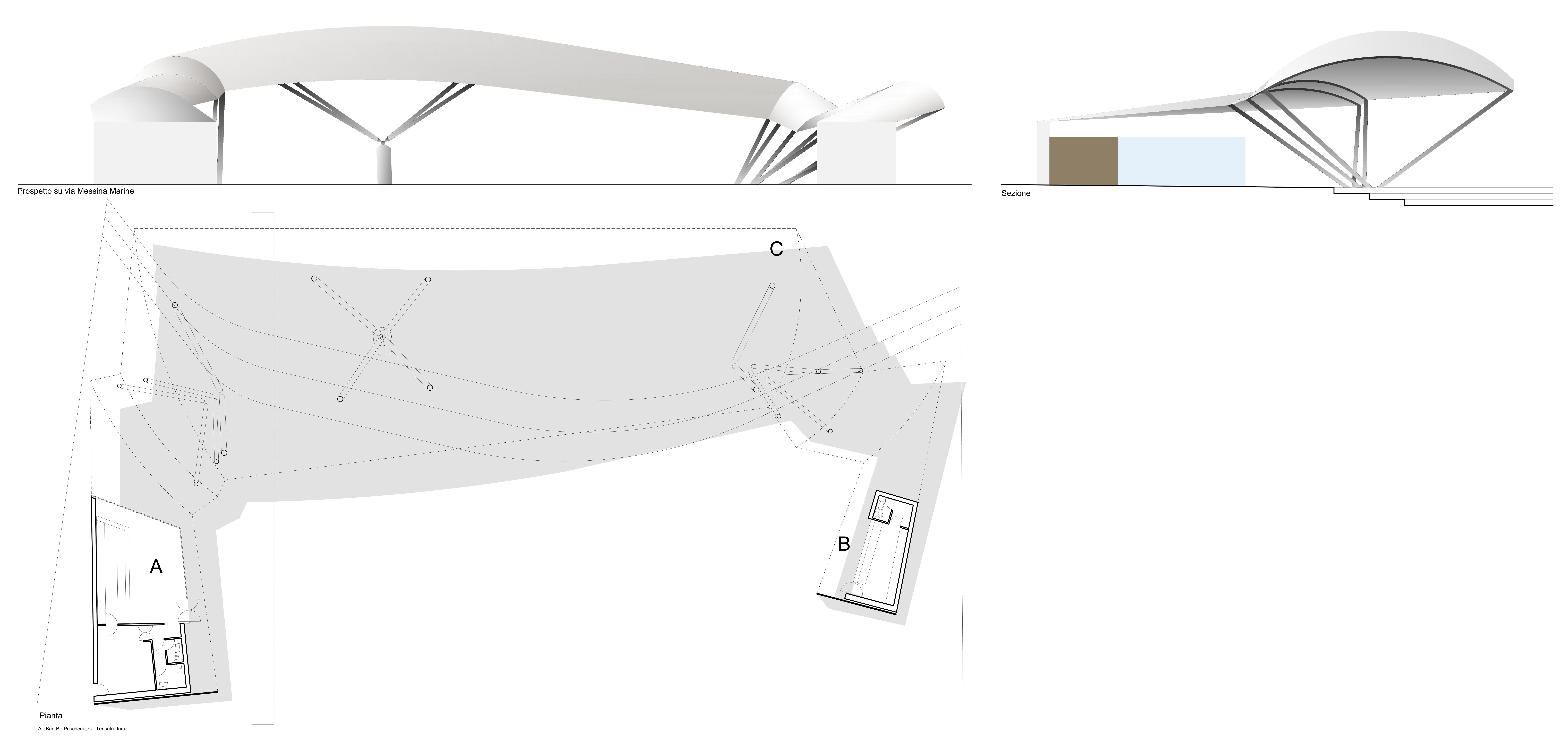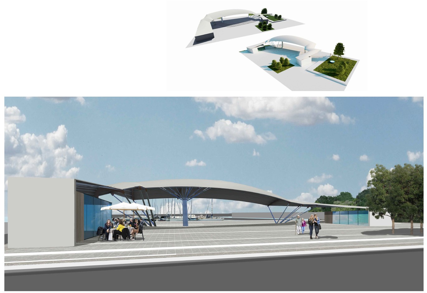 2. la realizzazione di un nuovo piazzale pedonale con attrezzature per lo svago (bar punto ristoro), valorizzazione di prodotti del mare (pescheria), per il gioco (bambini) e realizzazione di una tensostruttura per ombreggiare parte dello spazio pubblico, con funzione di piazza e belvedere sul porto;
